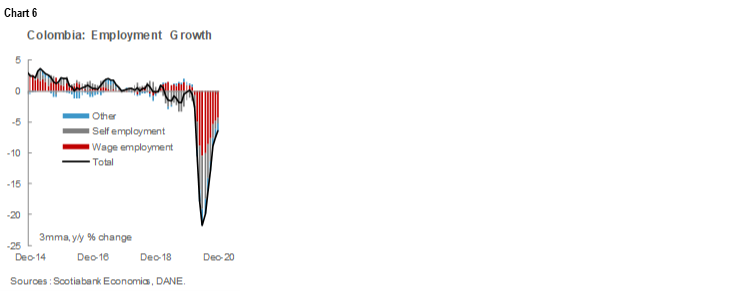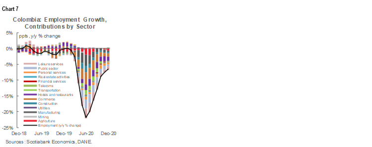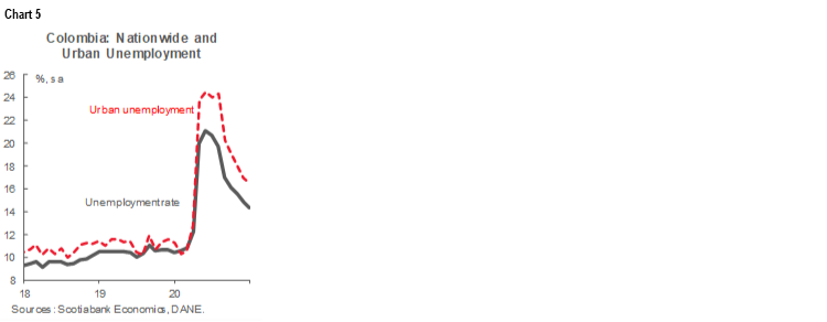 On Friday, January 29, DANE reported that in December, the nationwide unemployment rate came in at 13.4%, still well above December 2019’s 9.5% while the urban unemployment rate (i.e., for 13 major cities) came in at 15.6% versus 10.5% in December 2019. The seasonally adjusted series showed that the national unemployment rate improved to 14.3% versus 14.8% in November 2020, while the urban unemployment rate came down from 16.9% in November to 16.4% in December (chart 5). In all, the 2020 nationwide average unemployment rate was 15.9%, while the average urban rate was 18.2%—both significant deteriorations from 2019’s 10.5% and 11.2%, respectively.
