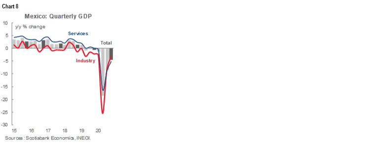 This sequential slowdown narrowed the gap in economic activity compared with Q4-2019 from -8.6% y/y to -4.5% y/y (chart 8), which beat the market consensus of -5.6% y/y. Still, this marked a seventh consecutive month of declines compared with the same quarter a year prior. The Q4 preliminary numbers imply that the average real GDP growth rate during 2020 was -8.3% y/y, the largest calendar-year drop in real GDP since the current series began in 1994, but slightly below our prior estimate of -9.1% y/y (see the January 25 Latam Weekly). GDP has now contracted for two consecutive years for the first time since the 2001–02 period owing to the structural weaknesses the Mexican economy faced before the COVID-19 crises began.