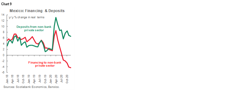 - Commercial bank financing to the private sector further accentuated its annual decline and went from -4.1% y/y in November to -4.4% y/y in December—its worst annual performance since records have been kept (chart 9). Direct financing also contracted from -4.2% y/y to -4.4% y/y. Within this segment, financing to companies recorded its largest-ever annual decline, from -4.0% y/y to -4.4% y/y, while consumer financing narrowed its annual gap from -11.3% y/y to -10.6% y/y. In the case of housing financing, it further retreated in real terms from -5.4% y/y in November to -5.8% y/y in December;