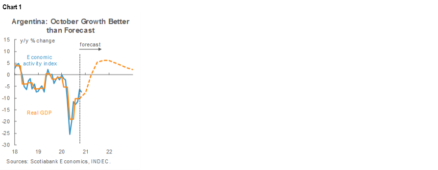 Argentina ended 2020 on some decent notes for the move into 2021. Growth in October came in a bit better than expected, while November trade, industrial production, and construction data reflected an ongoing recovery in domestic demand. Forward-looking indicators and December vehicle production pointed to continued gains in 2021. Still, the country’s external and fiscal positions remain precarious while negotiations with the IMF on a new loan stretch to the end of Q1 or later. We recap below some of the key data releases from the holidays.