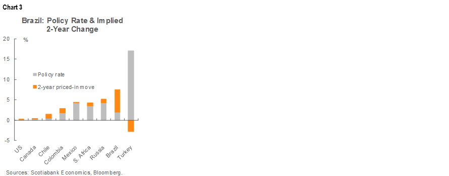 Brazilian markets, exemplified by the BRL, had a rough year in 2020. Among the world’s 31 most liquid currencies, the BRL was the second-worst performer last year (-22.5%), underperformed by only the ARS (-28.9%, chart 2). The real’s losses compare with declines in 2020 of only -5.0% for MXN, -4.5% for COP, and -8.4% for PEN. This means that the BRL already started the year having fared materially worse than its regional peers and could be set to close this gap. In addition, looking at what domestic yield curves are pricing in terms of central bank interest rate hikes, the arguments for a BRL catch-up start to gain further strength, with close to 550 bps of hikes priced into the next two years (chart 3). But this isn’t quite enough to validate a strong rebound in the real.