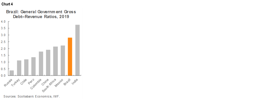 However, it’s worth considering that a weak fiscal position is already largely discounted by markets, given that Brazil lost its investment-grade credit rating years ago. In addition, by some metrics, the country’s fiscal position looks reasonably comparable to some higher-rated regional peers. Looking at the ratio of gross general government debt to GDP, Brazil has topped 100% and is among the weaker large economies in the world, with a debt burden around twice that of some of its regional peers. However, governments service debt with their revenues and not GDP. If we look at ratios of gross general government debt to public revenue, Brazil still looks highly indebted, but its capacity to service its debt is closer to that of some regional peers: for instance, its debt-to-revenue ratio is only about 1.25-times higher than Mexico’s (chart 4).