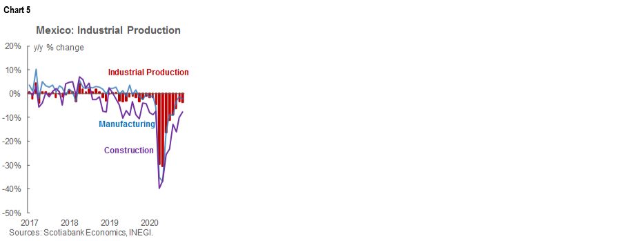 On Monday, January 11, INEGI released data for November’s industrial production (IP) that showed a moderation in its growth, going from a gain of 1.8% m/m sa in October to 1.1% m/m sa (versus 0.8% m/m sa expected in the Bloomberg consensus). The print raises some concern that the recovery might be losing momentum. The deceleration spanned IP’s major components: growth in the construction sector decelerated from 6.2% m/m sa to 2.2% m/m sa; mining went from 1.0% m/m sa to 0.1% m/m sa; manufacturing went from 1.8% m/m to 0.0% m/m, its slowest monthly rate since May; and utilities fell -2.3% m/m, also its worst monthly performance since May.