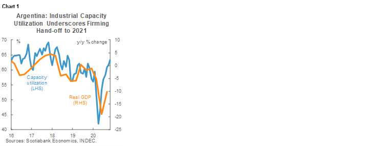 Argentina’s industrial capacity-utilization rate rose from 61.8% in October to 63.3% in November, its highest level since November 2018 (chart 1). This rate is marked by substantial seasonality in non-pandemic times and has fluctuated in recent years between December’s holiday-induced lows around 56% to highs in the mid-60s. Amidst April’s most comprehensive lockdowns, the rate fell to 42%, but has been on an uninterrupted rise since then. The revisiting of levels of capacity employment last seen two years ago coincides with November’s return to positive year-on-year growth in industrial production for the first time since the pandemic took hold in March, which we detailed in the January 12 Latam Daily. The ongoing rise in industrial capacity utilization adds to year-end evidence of strengthening domestic demand and a firming hand-off to 2020, but this is set to be undermined by rising new COVID-19 case numbers.