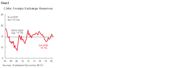 On Wednesday January 13, the Central Bank of Chile decided to initiate a gradual program of replenishment and expansion of its FX reserves to strengthen the country’s international liquidity position in preparation for the end in 2022 of Chile’s existing arrangement under the IMF’s Flexible Credit Line (FCL). The goal of this initiative is to increase the level of international reserves to around 18% of GDP, which implies that the BCCh will buy around USD 12 bn (chart 2).