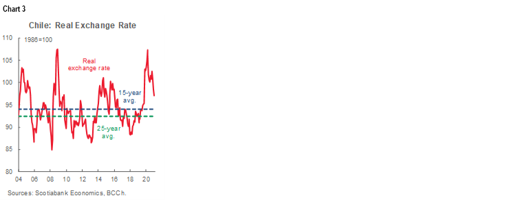 With this, the central bank will intervene in the FX market whenever the real exchange rate is at 97 (index 1986=100), around 3% higher than its historical average (chart 3), which in our view is an appreciated level given that the Chilean economy is going through a severe adjustment process and there are still wide output gaps stemming from the crisis caused by the pandemic. A couple of months ago the central bank noted that the equilibrium real exchange rate had depreciated as a result of the latest crisis.