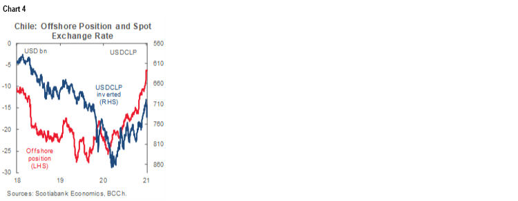At the same time, off-shore positions have increased their exposure to the CLP in recent months, which has intensified risks of depreciation if these positions are unwound. We will have to wait and see if this announcement will cause a sell-off of non-residents’ positions and further depreciate the CLP. In fact, the non-resident position on derivates/forwards reached USD -6.2 bn on Tuesday, January 12, after reaching USD -16 bn in early-November. Therefore, foreign investors bet in favour of the CLP by USD 10 bn in just a couple of months (chart 4).