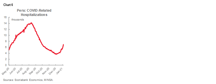 During a press conference on Tuesday, January 12, President Sagasti announced a new strategy to confront COVID-19. According to Mr Sagasti, the government views Peru as being in the early days of a second wave of COVID-19 (chart 6). As a result, the government has designed a differential response by region according to the degree of local virulence as given by the R ratio (i.e., the effective reproduction number). Each of Peru’s 24 regions will fall into one of three categories: moderate, high, or very high alert. Half of the regions and Lima have already been placed on high alert.