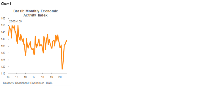 Brazil’s V-shaped recovery moderated its pace in November as sequential growth slowed from 0.75% m/m sa in October (revised from 0.86% m/m sa) to 0.59% m/m sa, a bit better than the Bloomberg consensus of 0.50% m/m sa. Without the seasonal adjustment, this represented a slight pullback in level terms from the previous month (chart 1). In annual terms, real activity closed its gap from 2019 further, moving from a shortfall of -2.84% y/y in October (revised from -2.61% y/y) to -0.83% y/y, above the -1.00% y/y consensus expectation. Much of the recent pick-up in activity was led by both goods and service sectors, with further gains set to be dampened by the end of fiscal support.