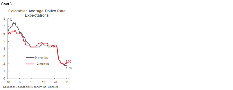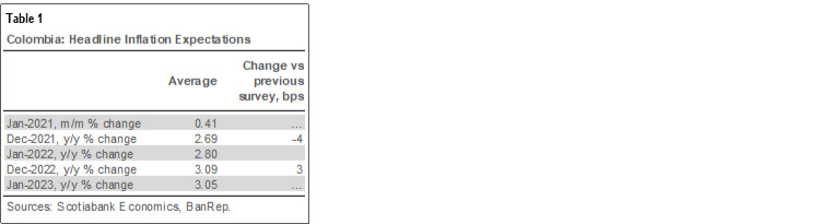 - On average, January’s monthly inflation is expected to come in at 0.41% m/m, slightly below January 2020’s rate (0.42% m/m), which would leave the consensus on annual inflation at 1.60% y/y to start 2021. In January, Colombian inflation should reflect upside pressures from foodstuff prices, gasoline prices, and some utility fees. However, at Scotiabank Economics we anticipate only moderate indexing effects on prices such as rental fees, among others, which leads us to expect a lower-than-consensus rate of inflation at 0.34% m/m and 1.53% y/y for the first month of 2021.