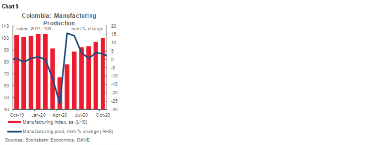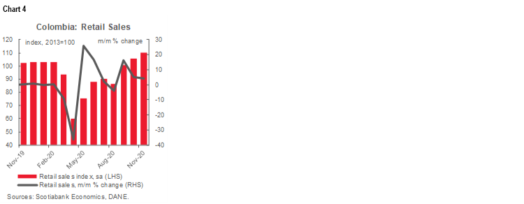 Retail sales were up 4.1% y/y in November, as the VAT holiday incited household consumption ahead of year-end celebrations. In seasonally-adjusted terms, total retail sales, ex-other vehicles, rose by 4.4% m/m in November, a decent gain on October’s levels (chart 4). By sector, computer equipment (up 44.9% y/y), home appliances (up 43.4% y/y), and sound equipment (up 55.5% y/y) were the best performing segments, while annual sales growth in retail sales of gasoline (down -5.7% y/y), other vehicles (off -11.7% y/y), and vehicles for household use (down -6.3%y/y) remained in negative territory. In Bogota, retail sales, ex-fuel, grew by 37.8% y/y. For the first 11 months of 2020, retail sale sales contracted by -8.4% y/y, while employment fell by -6.5%, especially in the clothing segment. By region, Cundinamarca and Bogota accounted for two-thirds of 2020’s contraction through November.