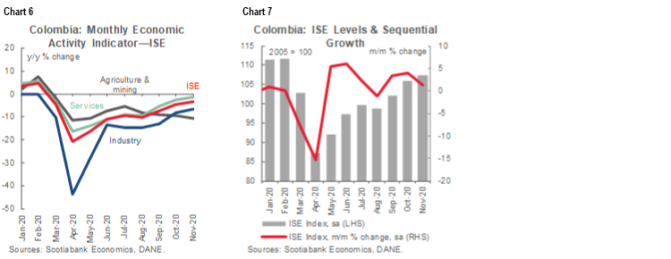 On Monday, January 18, DANE released November’s Economic Activity Indicator (i.e., ISE, the main GDP proxy), which showed a new improvement from October’s levels mainly owing to the consolidation in the re-opening process (chart 6). November’s annual contraction of -3.4% y/y was the best performance since April’s low (-20.5% y/y), when Colombia went through the worst phase of the lockdown. On a seasonally-adjusted basis, the economy expanded 1.2% m/m, which pointed to a moderation in the recovery after October’s 3.9% m/m sa gains (chart 7). In the details: