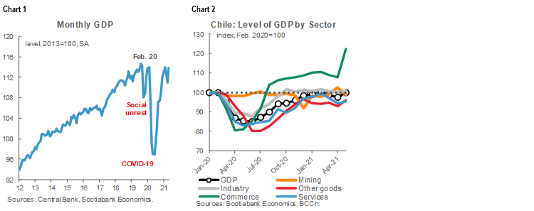 IMACE economic activity indicators for May showing an increase of 18.1 % y/y (2.6% m/m) suggest the economy has adjusted to mobility restrictions. This accommodation effect supports our early view of GDP expansion of not less than 7.5% in 2021 (chart 1). We maintain our forecast of a GDP growth range between 7.5% and 8.5%. However, the loss of salaried employment raises concerns regarding the resiliency of the labor market in the medium term, and complicates political narratives in which the recovery of GDP to pre-Covid levels (chart 2) is tempered by a significant employment gap (1 million jobs to recover).