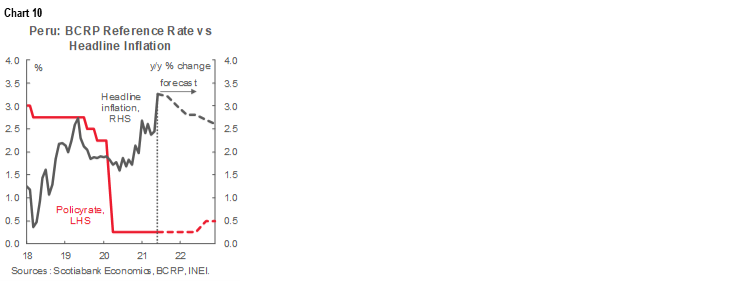 Inflation jumped in June, exceeding the upper limit of the 3.0% target range (chart 10). Inflation printed at 0.52% m/m in June, up from + 0.27% m/m in April, and materially above the Bloomberg consensus of 0.20% m/m and our own forecast of 0.30% m/m. Headline inflation rose from 2.45% y/y in May to 3.25% y/y in June, above the upper limit of the target range (between 1% and 3%) for the first time in August 2017 and reaching the highest pace since April 2017. This rate also exceeds the BCRP's year-end forecast, which had recently been revised from 2.0% y/y to 3.0% y/y. Core inflation rose slightly, from 1.76% y/y in May to 1.89% y/y in June, but remains comfortably below the 2% y/y target for headline inflation.