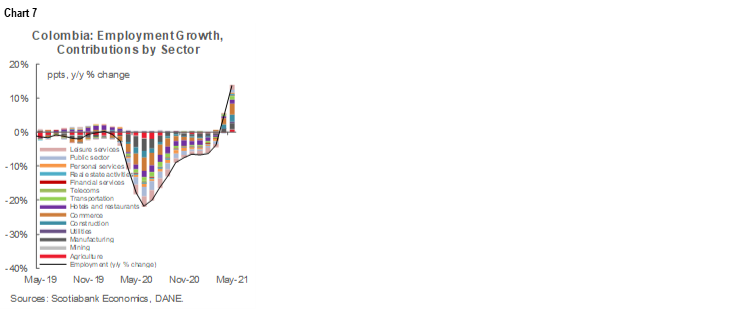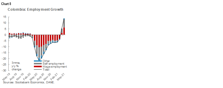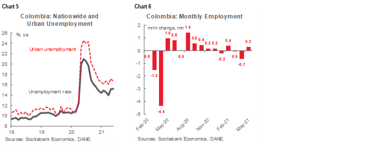 On Wednesday, June 30, the Colombian statistical agency DANE reported May's unemployment rate was 15.6% (not seasonally adjusted) (chart 5). This outcome is below the May 2020 level of 21.4%, but still well above the pre-pandemic (May 2019) level of 10.5%. The urban unemployment rate for 13 major cities was 16.6%, lower than the 18.2% rate expected by Bloomberg’s survey market consensus). On a seasonally adjusted basis, the national unemployment rate was broadly unchanged at 15.2% in May versus 15.1% in April 2021, while the urban unemployment rate surprisingly fell from 17.1% in April 2021 to 16.5% in May (chart 6). Employment results surprised on the upside, since active jobs increased despite disruptions resulting from the nationwide strike.