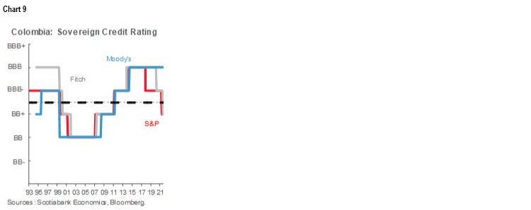 The last time Colombia lost its investment-grade level was in 1999, and it took until 2011 to reach the investment-grade level again (chart 9). However, we think the current situation is better since Colombia is more open to international markets and local institutions remain sound and stable, improving prospects to reach investment grade again.