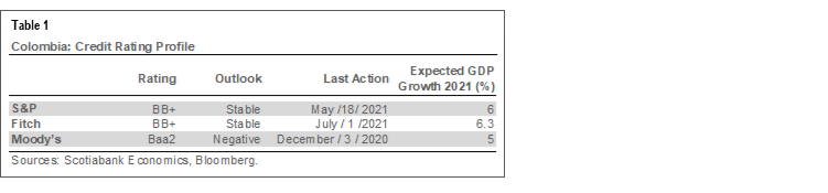 Fitch downgraded Colombia's Long-Term Foreign-Currency and Local-Currency sovereign rating to BB+ from BBB, with a “stable” Outlook (table 1). Fitch projects debt will increase through 2022 with little chance of a reduction over the medium-term, which means that Colombia would maintain a debt-to-GDP ratio above 60%. This ratio is double the 30% of GDP level when Fitch upgraded Colombia to the BBB group in 2011. However, Fitch revised up its 2021 GDP growth forecast from 4.9% to 6.3% and assesses risks to the upside, although uncertainty remains high. The current account deficit is expected to widen to 4.1% of GDP in 2021, with significant financing from the FDI.