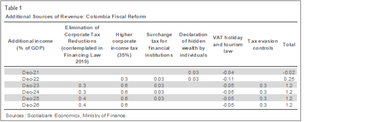 - The Fiscal Reform bill aims to eliminate the withholding tax on fixed-income investments (public and private), looking to improve the competitivity and attract further investors. This last change also should contribute to improving conditions to financing the budgetary needs. The current withholding tax is at 5% after being reduced in the National Developed Plan in May 2019 from 14%.