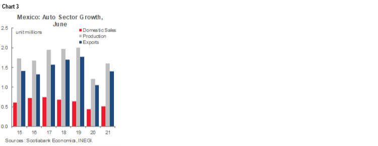 According to the INEGI release of auto industry data for June, the sector continues to recover at a moderate pace. Microprocessor supply chain disruptions continue to keep the sector’s production below capacity, with some estimates suggesting microchip shortages could continue beyond year-end. Auto production and sales advanced 9.3% m/m and 1.7% m/m, at 264.0 thousand and 87.1 thousand units, respectively, while exports fell 3.2% m/m to 234.4 thousand units (chart 3). On a year-over-basis, the auto industry reported significant upsurges owing to base effects. Production advanced 5.5% y/y, exports rose 18.3% y/y, and domestic sales grew 38.5% y/y. Cumulative data from January to June show auto production increased 31.8% YTD, exports grew 33.5% YTD and domestic sales advanced 18.1% YTD. However, production, exports and domestic sales remain -20.5%, -19.5%, and -20.5% below January–June 2019 levels, respectively. Cumulative data thus suggest a slow, yet firm recovery, although the industry has still not recovered pre-pandemic levels.