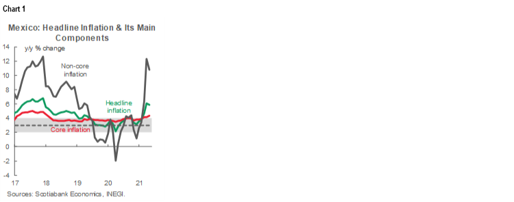 According to data released by Statistical Agency, INEGI, on June 9, CPI declined in May to 5.89% y/y, from 6.08% y/y the previous month (chart 1), slightly above the Bloomberg consensus (5.86% y/y) and materially above the high end of Banxico’s target range. This was the third consecutive month surpassing the 4.00% y/y upper limit of Banxico’s target band. We maintain our view that the central bank will keep its key target rate on hold at 4.00% y/y through the remainder of 2021.