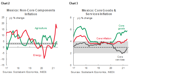 The moderating inflation components were non-core items that softened their sub-index inflation from 12.34% y/y to 10.76% y/y (chart 1 again). Pressures in energy prices slowed from 19.30% y/y to 15.97% y/y, which was partly offset by agricultural prices where inflation rose from 4.08% y/y to 4.67% y/y (chart 2). Core inflation maintained an upwards trend as it moved from 4.13% y/y to 4.37% y/y (chart 1 again), with pressure from both goods prices (5.76% y/y from a previous 5.59% y/y) and services (up from 2.53% y/y to 2.84% y/y) (chart 3).