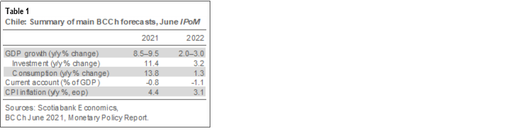 CHILE: QUARTERLY MONETARY POLICY REPORT, GDP FORECAST UP (TO 8.5%–9.5% Y/Y) AND POLICY RATE HOLDS AT 0.5%