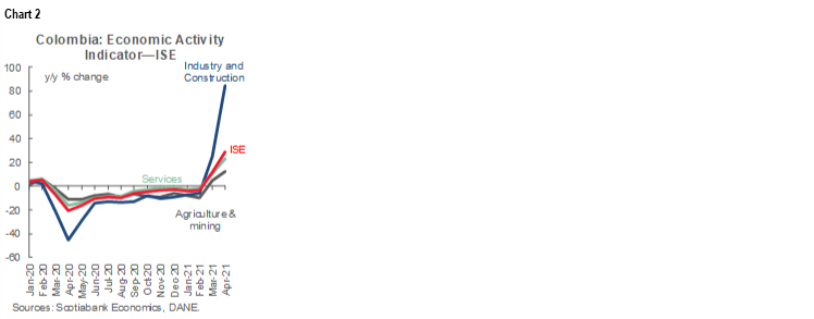 On Friday, June 18, Colombia’s Statistical Agency (DANE) released April’s Economic Activity Indicator (i.e., ISE, the main GDP proxy). On a seasonally adjusted basis, April’s economic activity expanded by 0.3% m/m (chart 1), despite new health restrictions imposed to contain the third wave of COVID-19. Compared with the same month in 2020, April’s activity expanded by 28.7% y/y, given the very low base in April 2020 (the weakest month since the pandemic began). April’s result landed above our expectations (+25.1% y/y) but below market consensus (+30% y/y according to Bloomberg). Commerce, hotels, and transport were the hardest-hit sectors in April as they were impacted by lockdowns. Construction, meanwhile, led a strong rebound, boosting the secondary sector. YTD economic activity grew by 6.9%.