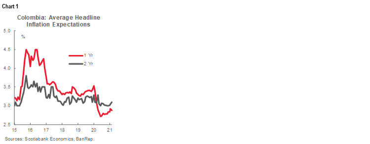 COLOMBIA: BANREP’S MAY SURVEY OF ANALYSTS SHOWED HIGHER INFLATION PROJECTIONS FOR 2021 AND ANCHORED EXPECTATIONS OVER THE LONG RUN; FIRST RATE HIKE EXPECTED BY DEC-2021