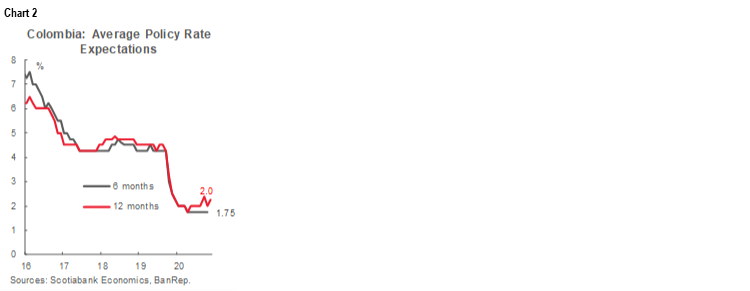 - Policy rates. BanRep’s repo rate is expected to stay at 1.75% through November, but, for the first-time, the median of analysts’ expectations envisions one 25 bps hike in December to take the repo rate to 2% by end-2021 (chart 2); for end-2022, the consensus median expects a policy rate of 3.0%. Our forecast is more front-loaded, with a first hike in Sept-2021.