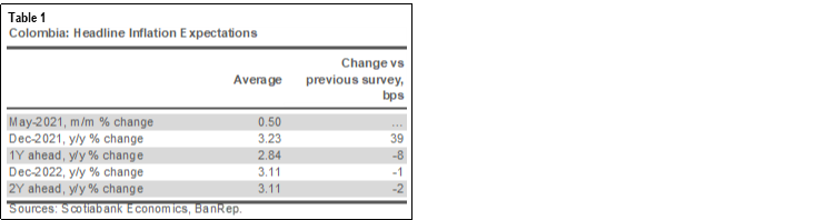 BanRep released the May edition of its monthly survey of economic analysts with data collected over the period May 6 to 12. The results showed higher inflation projections for 2021, still-anchored expectations over the longer run, and anticipation of a first rate hike from the BanRep Board by December 2021.
