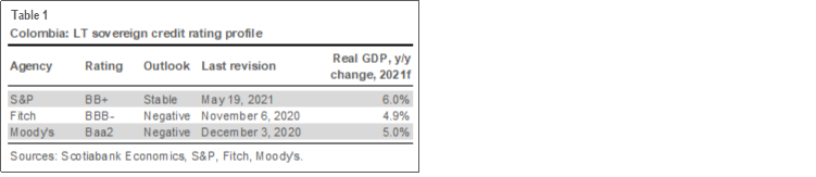 The credit-rating agency emphasized that a positive revision could follow if Colombia’s 2021 growth tracks more strongly than the 6.0% y/y that S&P forecasts for 2021 (table 1, again).