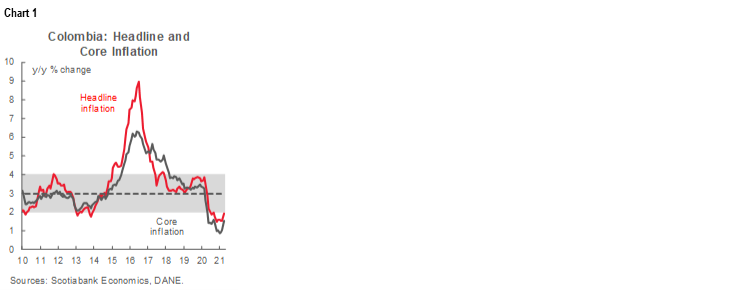 April price data, published late on Monday, May 5, by DANE, put sequential inflation at 0.59% m/m sa, once again well above both market consensus (BanRep and Bloomberg surveys: 0.32% m/m) and Scotiabank Economics’ own projection (0.29% m/m). Foodstuff inflation, along with the lodging and utility groups, contributed the most to the positive surprise, which took monthly inflation up from 0.59% m/m in March. This moved annual headline inflation up from 1.51% y/y in March to 1.95% y/y in April (chart 1), just below the 2–4% y/y target range—which puts in sight our 3.1% y/y forecast for end-2021.