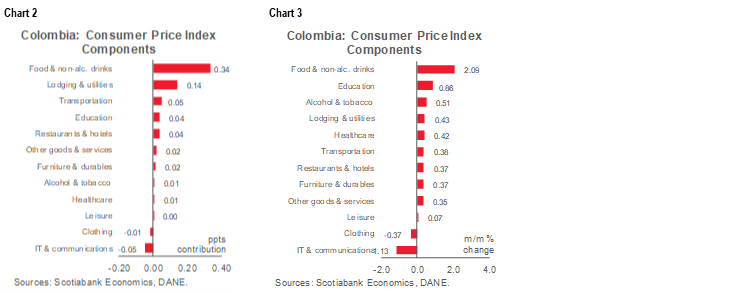 - On the negative side, prices for IT and communications fell (-5 bps and -1.13% m/m) owing to better fees on mobile plans. A new player in the sector has launched its service at lower prices and incumbent companies have responded by lowering their tariffs as well. In the same vein, clothing group prices also softened (-1 bps and -0.37% m/m) amid weaker demand due to the lockdowns during weekends in Colombia’s main cities.
