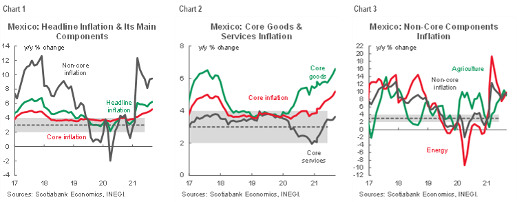 In terms of monetary policy implications, we maintain our expectation of a 25 basis point increase at the Bank of Mexico’s policy meeting tomorrow (Thursday). However, the composition of board votes could change, taking into account that a majority (but not all) members consider the decision to raise rates a useful signal of commitment to the inflation target, therefore it is possible that at least one member could vote for a 50 bps hike. However, all board members seem to agree that the increase might not be effective in tackling down inflation given its mainly supply-side nature.