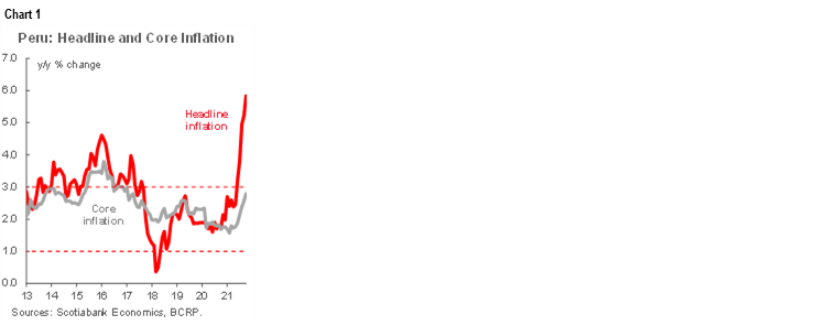 Peru’s inflation increased 0.58% m/m in October, higher than the Bloomberg consensus of 0.24% m/m, but in line with our forecast of 0.55% m/m. Headline annual inflation jumped from 5.2% y/y in September to 5.8% y/y in October (chart 1), surpassing the upper limit of the central bank’s target range (between 1% and 3%) for the fifth consecutive month, and reaching levels not seen since the beginning of 2009. Inflation has been surprisingly strong and is moving further and further away from the BCRP’s inflation forecast of 4.9% for this year. However, these results are in line with our inflation forecast of 6.5% for the full year in 2021 and 4.5% for 2022.