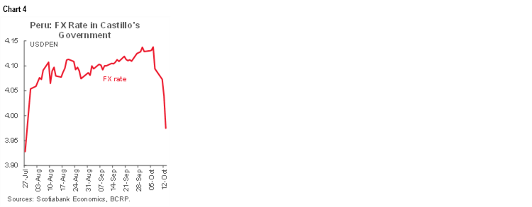 Positive market sentiment continues after the last week’s cabinet changes. The country’s currency, PEN, which is the variable most sensitive to expectations, posted the best performance among emerging market currencies on Wednesday, October 13th (+ 1.7%), along with the South African rand (+ 1.1% ZAR) and the Swedish krona (+ 1.1% SEK), reaching its best level in two and a half months, accumulating an appreciation of 4% from its record of 4.14 (chart 4)