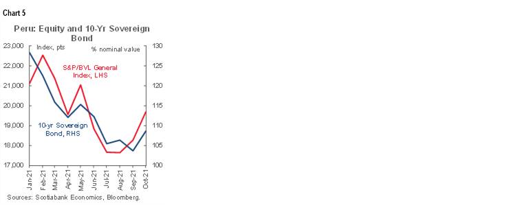 Other Peru’s assets have also reflected a quick reaction from investors to recent political changes. So far in October the general index of the stock market (S&P/BVL) has risen 7.7% (chart 5), the yield of the 10-year sovereign bonds has fallen 66bps and the global bond in dollars in 10 years 17bps, while that 5-year CDS has been reduced by 12bps.