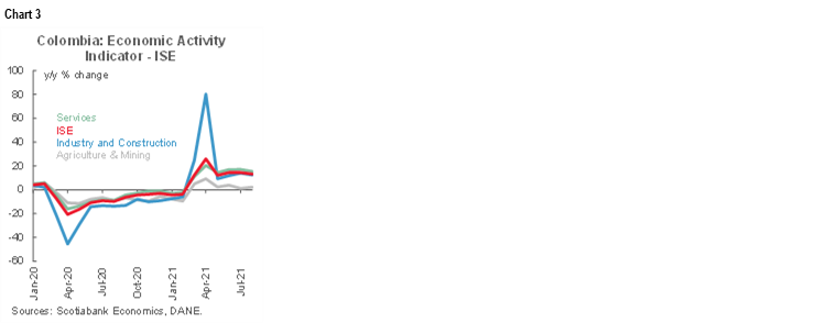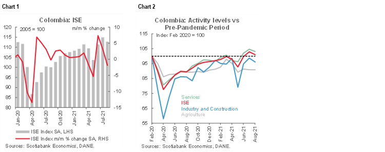 On Tuesday, October 19, Colombia’s Statistical Agency (DANE) released August’s Economic Activity Indicator (ISE, the main GDP proxy). Compared with the same month in 2020, August’s activity expanded by 13.3% y/y, below the market consensus of 15.5% y/y according to Bloomberg; and below the previous month’s 14.3% y/y, defying any diminishing base effects. On a seasonally adjusted basis, Colombia’s economic activity contracted by 1.9% m/m (chart 1), interrupting solid gains of previous months as the construction sector is weakening. August’s result would configure a dovish signal for the central bank as the economic recovery still has some room to close the remaining activity gap (chart 2). This new data reaffirms our expectation of a 25 bps hike at the upcoming BanRep monetary policy meeting on October 29.