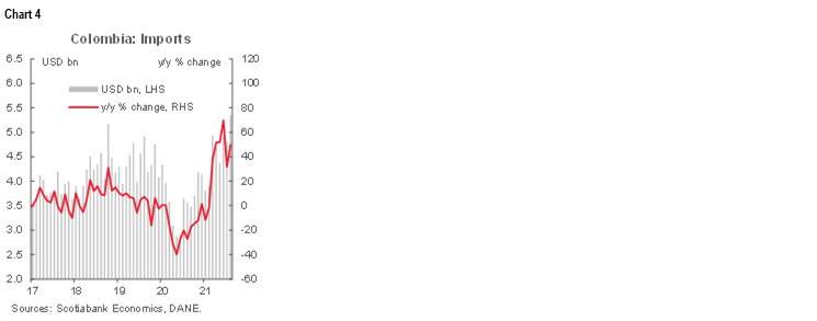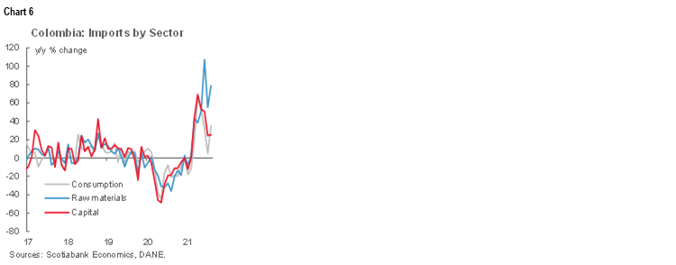 August imports data, released by DANE on Tuesday, October 19, came in at USD 5.35 bn (CIF terms), expanding 49.8% y/y (chart 4), reaching their highest level since December 2014. Compared with August 2019, imports increased by 8.9%, showing two effects: i) a better-than-expected economic recovery, and ii) the impact of higher international commodities prices. Raw material imports are close to the historical high, while capital goods imports are in the best levels since the pandemic began and, consistent with the previous month (yet again), investment-related imports are boding well for medium-term FDI.