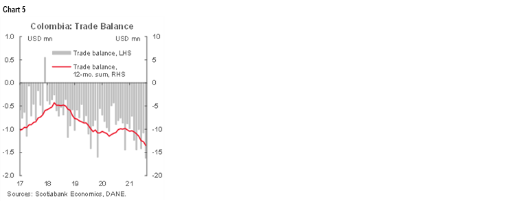 Manufacturing imports grew by 45.1% y/y (+12.8% versus August-2019) accounting for the strongest positive contribution to annual imports growth, while agriculture-related imports increased by 45.2% y/y and mining-related imports grew by 129.9% y/y. As a result, the monthly trade deficit widened to USD 1.62 bn (FOB) (chart 5), Colombia’s YTD trade deficit stood at USD 9.5 bn for January–August affirming our expectation of a current account deficit of 5.2% of GDP in 2021.