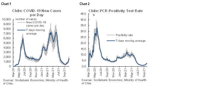 The measure is based on the rise in COVID-19 cases in recent weeks (chart 1). According to government figures, the PCR positivity test rate increased to 4% in the Metropolitan Region and to 2.7% in the whole country (chart 2). It is worth noting that Chile’s vaccination campaign has reached 90% of the eligible population, while the rollout of booster (third) doses keeps moving forward, now surpassing 5 million people.