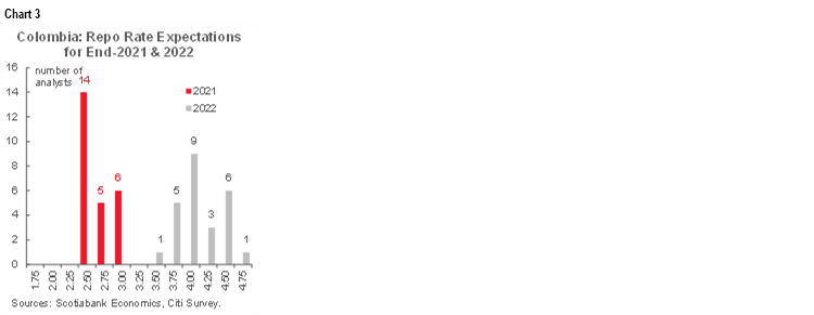 - Analysts are divided amid October’s monetary policy meeting. 17 out of the 25 analysts (68%) expect a 25 bps hike in the monetary policy rate for the October 29 meeting (Friday), while 8 analysts expect a 50 bps hike. For Dec-2021, the majority expect the monetary policy rate closing at 2.50%, in Scotiabank Economics we expect the same, while five analysts expect a close at 2.75% and six at 3%. For 2022, the median policy rate expected is 4%, in Scotiabank Economics, we expect for Dec-2022 the rate at 4.50% (chart 3).
