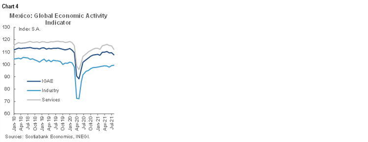 Statistical agency (INEGI) published the monthly GDP proxy (IGAE) (chart 4), or economic activity index for August, which declined more than had been expected from 0.1% m/m to -1.6% m/m (versus 0.2% m/m of consensus) measured with seasonally adjusted series. Within sectors, the industry moderated from 1.2% m/m to 0.4% m/m on a monthly basis, affected by the disruptions in value chains and input scarcity, especially in manufacturing and the automotive industry. Services fell sharply from -0.2% to -2.5% m/m, in line with the increase in contagion from the Delta variant and lower consumer confidence, although restrictions were not as stringent as in the two previous COVID-19 waves. In particular, professional services plummeted -31.4% m/m, affected by the implementation of the outsourcing reform, which limited outsourcing services and forced companies to incorporate formerly outsourced employees, although the effect was most likely statistically intensified by the subindex methodology. Retail services moderated, wholesale trade dropped, and hospitality services was the only subsector that increased in August. In September, consumer confidence advanced as contagion rates diminished notably, thus we expect better consumption conditions in services for the coming months. Lastly, agricultural and livestock activities declined -2.4% m/m from 1.0% m/m previously.