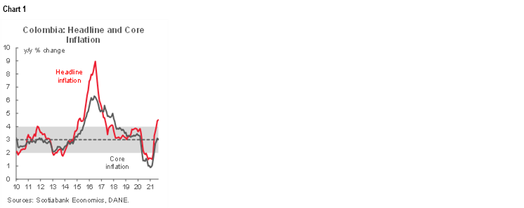 Monthly CPI inflation was 0.38% m/m in September 2021, according to DANE data published on Tuesday, October 5. This result is close to the median forecast in BanRep’s survey (0.30% m/m), Bloomberg’s survey (0.35% m/m), Scotiabank Economics’ projection (0.32% m/m) and the previous month’s 0.45% m/m. However, its breakdown deserves a closer look, because despite the overall number being closer to expectations, its composition was surprising as core inflation fell while annual headline inflation rose.