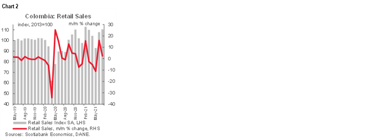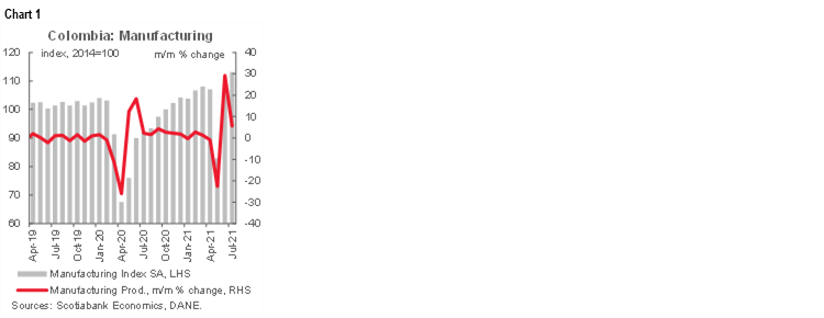 July manufacturing production and retail sales data published by Colombia’s statistical agency (DANE) on September 15 showed that Colombian economic activity continued posting stronger-than-expected gains as the reopening consolidates. As economic activity is recovering faster than expected, we are again revising up our GDP forecast from 7.4% to 8.2% for 2021 and to 4.4% (from 4.2%) for 2022, considering July’s coincident indicators results and soft data such as commercial confidence, energy demand, gasoline demand and mobility indicators for July and August. This scenario affirms our expectation of a 25 bps rate hike at the next BanRep meeting (September 30), though consensus is split (see below article on economic survey results).