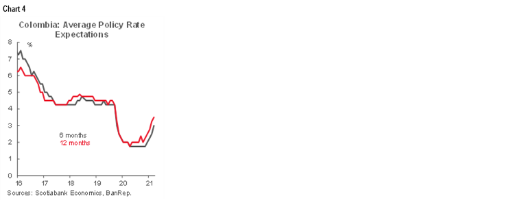 - Policy rate. Consensus on average expects three rate hikes of 25 bps this year in the policy rate, which would close at 2.50% in 2021 (from the current 1.75%); the first movement is anticipated in September (chart 4). Scotiabank Economics’ forecast is aligned with the consensus. For 2022, consensus expects a policy rate at 4.0% by the end of the year, 50 bps higher than in the previous survey. Scotiabank Economics’ forecast was recently changed we now expect a 4.50% rate for Dec-2022 assuming a path of 25 bps hikes at every decision-making meeting.