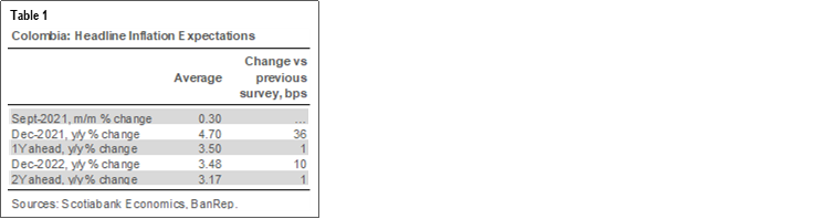 - Near-term inflation. September’s monthly inflation is expected to come in at 0.30% m/m, putting annual inflation to September at 4.42% y/y (from the 4.44% in August). Having said that, survey dispersion remained high with a minimum expectation of 0.0% m/m and a maximum of +0.45% m/m, signaling still high uncertainty amid recent developments and their impact on prices. Scotiabank Economics expects September’s monthly inflation at +0.32% m/m and 4.44% y/y, given that food inflation, among other prices related to the reopening would rise again.