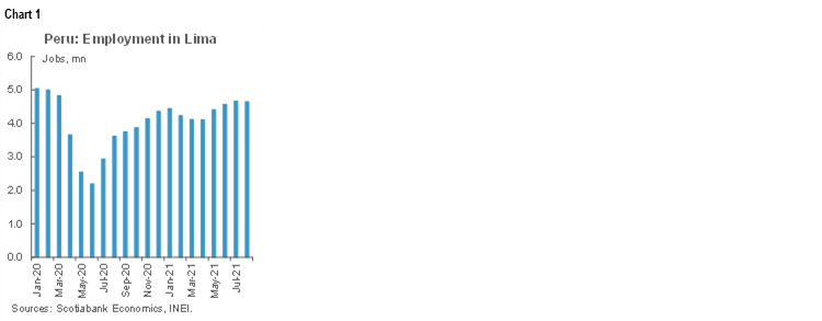 The Lima employment scenario is showing the first signs of a slowdown. According to figures by the National Statistics Institute, INEI, there were just under 4.65 million people employed in the formal sector in Lima in the three months ending in August, down from 4.67 million employed in the three months ending in July (chart 1). Although the difference was marginal, it is significant in that it was the first decline in jobs since March, and, perhaps more importantly, the first decline that was not linked to COVID-19 control measures and mobility restrictions since the lockdown began in March 2020. Thus, the data suggest that the earlier improvement in the Lima jobs market, seen as a month-on-month trend, has slowed, perhaps as a result of political uncertainty.