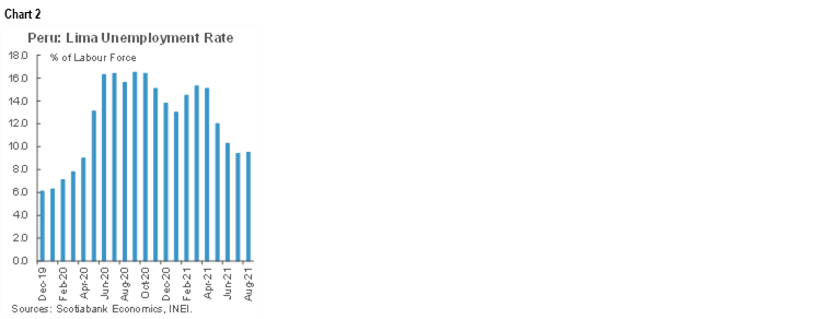 Similarly, the unemployment rate ticked up from 9.4% to 9.5% (chart 2), the first increase since February, when a partial lockdown was put in place, and the first increase not linked to new lockdown restrictions since the pandemic began. There is a caveat, however. The information provided so far for August by the INEI only encompasses Lima. Government programs, mostly ongoing and a legacy from the earlier administration, focus more on rural areas outside of Lima. Employment may have continued to improve in regions outside of Lima in August.