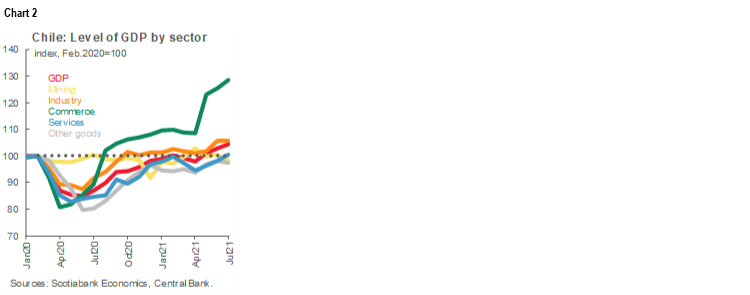 On Wednesday, September 1st, the Central Bank (BCCh) released July’s monthly economic activity index (Imacec), showing GDP grew 18.1% y/y (+1.4% m/m), in line with consensus and our own expectation. According to the BCCh, services activities were the ones that contributed the most to the y/y and m/m figures, in part due to higher degrees of mobility given the gradual economic reopening and the adaptation of households to the COVID-19 emergency. With this, the seasonally adjusted Imacec reached historically high levels, similar to those of the trend existing before the social unrest (chart 1).